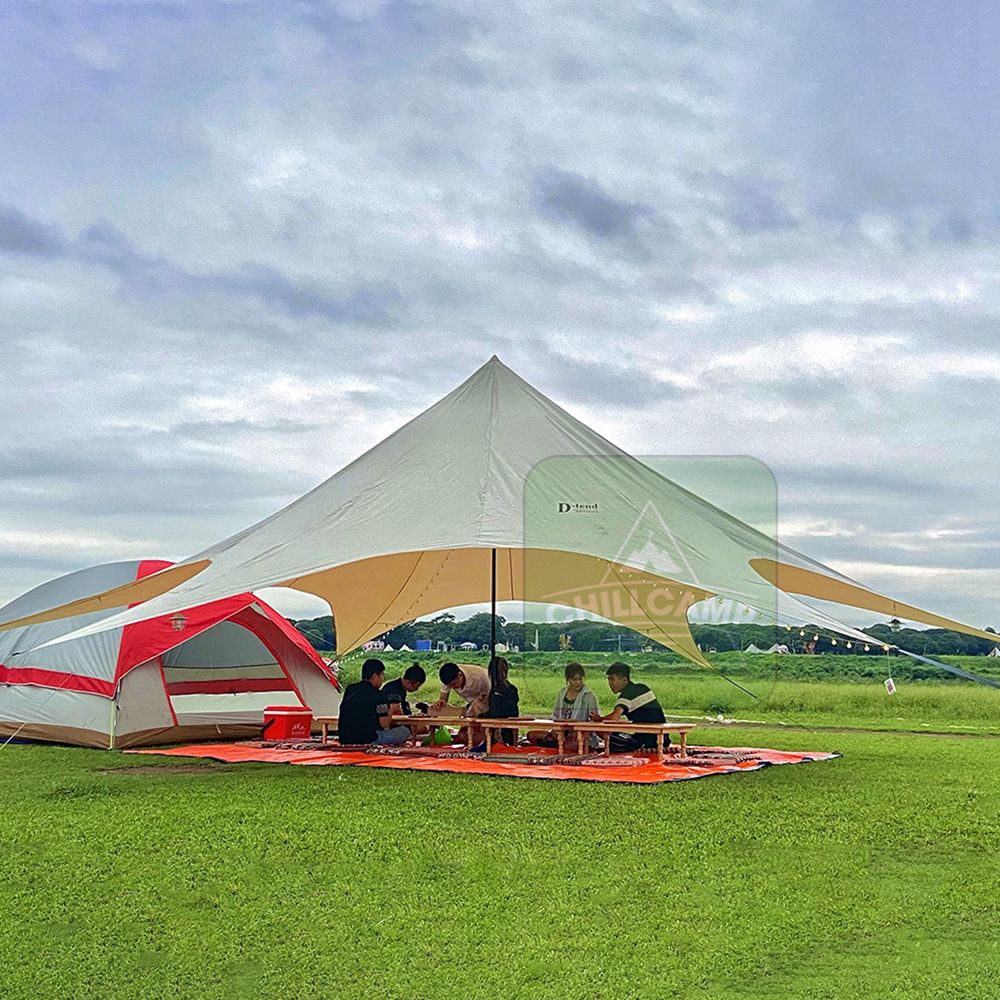 Mái che là vật dụng không bắt buộc, nhưng sẽ tiện nghi hơn rất nhiều trong trường hợp mưa lớn ẩm ướt. Nó giúp cản bớt áp lực mưa và gió trong trường hợp lều của bạn chất lượng không quá tốt. Mái che còn cung cấp một không gian khô ráo lớn, đủ cho bạn dạo chơi xung quanh, kê bàn ăn và nấu nướng. Trời mưa kéo dài cũng gây khó khăn cho việc giữ quần áo khô ráo, mái che sẽ giúp bạn có chỗ phơi đồ thay vì để quần áo ướt trong túi và mang về nhà. Hiện trên thị trường có những dạng tấm tăng/mái che hiện đại, dễ dàng mang theo và lắp đặt.